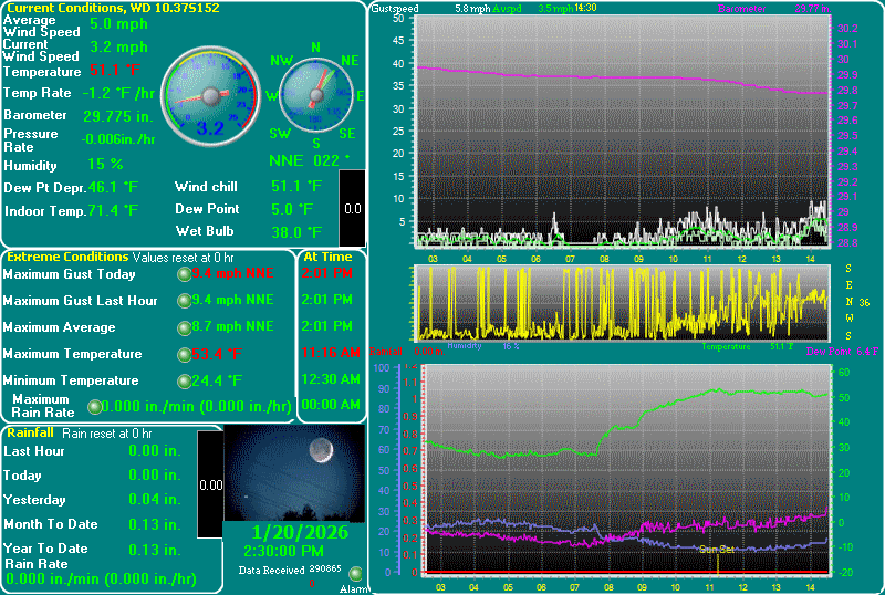 | Maximum Gust (since midnight) | 8.1 mph at: 10:58 AM | Maximum 1 minute average (since midnight) | 6.2 mph at: 10:34 AM |